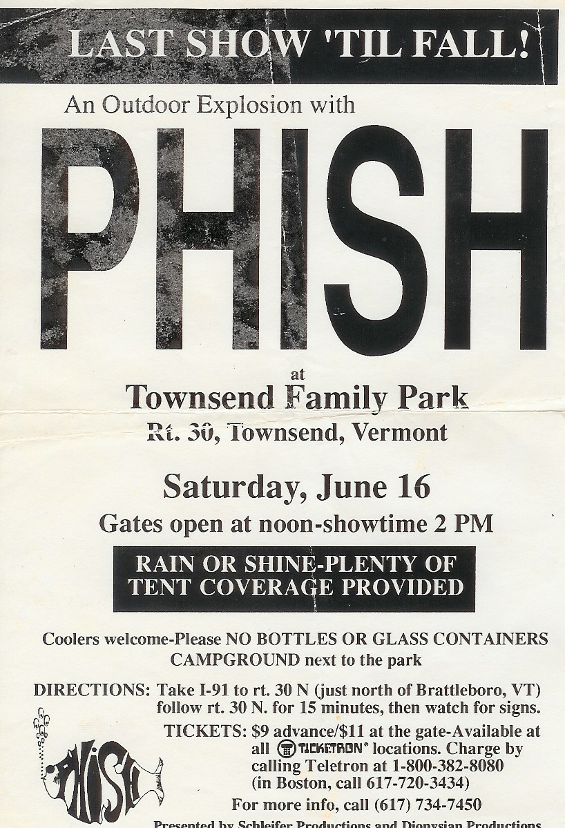 Might as well kick off this blog with a track from 21 years ago today, which also happens to be my first show. Townshend Park was a great place to see a concert. Surrounded by green mountains with a river running through it, the place was simply beautiful. People were tubing down the river the whole show, and if you didn’t have the $9 to get in, all you had to do was wade across the river and you were in. On site camping and mini golf added to the awesome factor. Weather was great and so was the show- 3 sets starting around 2PM and ending before sundown (no lights). I think there were probably about 600 or 700 people there, which was a big show for the time. The band played up on this weird little porch thing that I thought was going to collapse during Good Times Bad Times. A highlight of the show is this set two closing Antelope. Check it out: