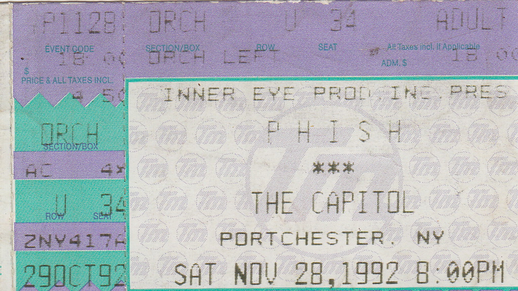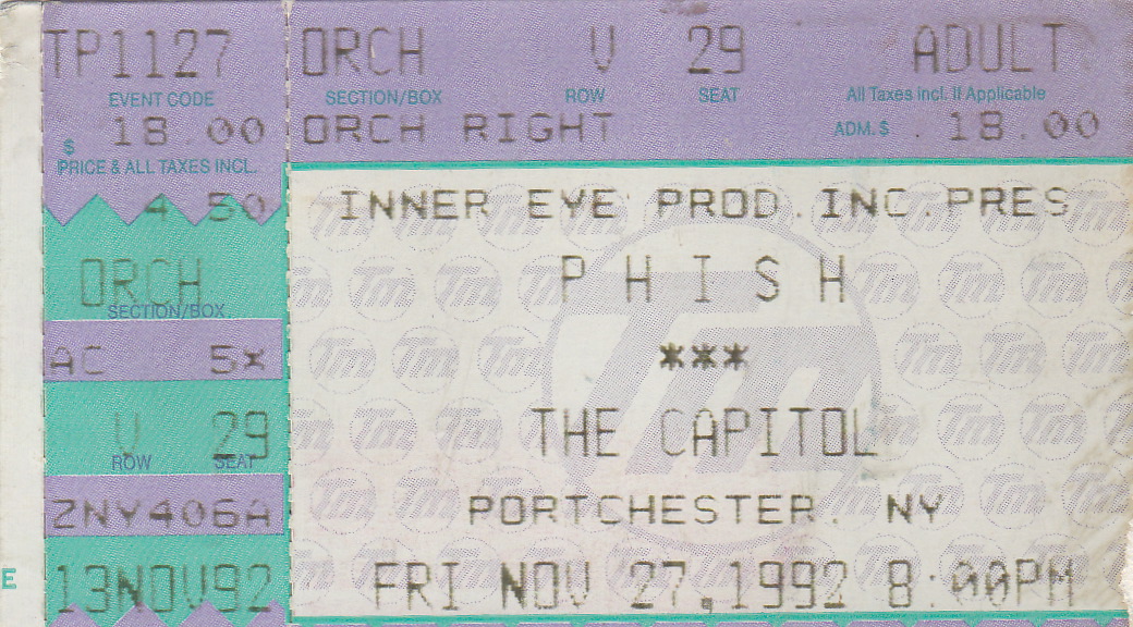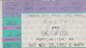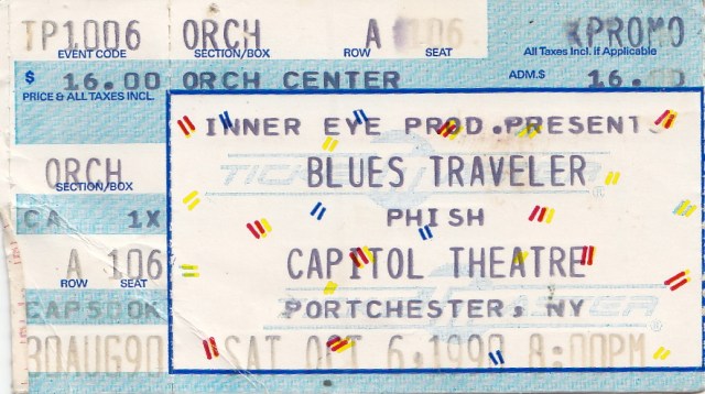 Tomorrow being 10/6, I figured I would throw up a quick one from the first time Phish played the Capitol Theatre. I’ll get more into the significance of the Capitol Theatre when I showcase a full, headlining show from this venue in the future. I first went to the Capitol in 1982 or 1983 when I went to see the AC/DC Let There Be Rock concert film, which did indeed rock. This was a somewhat “hometown” show for me as my parents lived right over the border in Connecticut. My friend Jeannie worked at Utopia (local head shop) where they had a Ticketmaster outlet. She got me the first ticket out of the computer (check it out above), front row center. Stoked! Unfortunately, this was not a headlining gig and Teh Phish was opening up for Blues Traveler. It’s interesting to look back at the paths each band has taken, but at this time, BT was the hottest thing going on the jam band scene (to most people) with Phish and Spin Doctors battling it out for second. Funny how things change…..Anyway, this was pretty hot for a one set show and they closed with the debut of the Popper/Anastasio tune “Don’t Get Me Wrong”. A pretty straight-ahead rock tune, they only did this one three times…