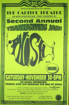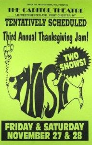 Gobble, Gobble motherfuckers…..Years before Worcester was the place to be on Thanksgiving, the Capitol Theatre in Portchester (or Port Chester) hosted some great Turkey Day blowouts….This was perfect for me as my parents only lived 20 minutes from the theatre. While we never got a 60 minute Runaway Jim or a Wipeout-laden slaughter fest like Worcester, the Thanksgiving shows at the Cap were always a killer time. Following an opening stint for Blues Traveler on 10/6/90, Phish returned for their first headlining gig on 11/24/90. This would be the first headlining show of 6 the band would play at this storied venue (plus the 10/6 opening slot show). I was lucky enough to attend them all. The Capitol Theatre was a historic venue, having hosted countless GD shows and others in the 60’s and early 70’s. When I was growing up, it was mostly a movie theatre (I saw the AC/DC movie there.) Situated right in the middle of downtown Portchester it was a snap to get to by car or train. It bordered Connecticut so a lot of New England peeps would come, but it was also only a half hour train ride from NYC so there was a great mix of people. I loved it because I could rock Las Brisas restaurant before the show, and still buy beer after the show (which was a no-go in Connecticut). There was always a pretty raging scene outside the venue and around the train station as well, which was pretty uncommon for the time. It was fairly small and intimate by today’s standards, and the balcony and the lobby were both always rocking.