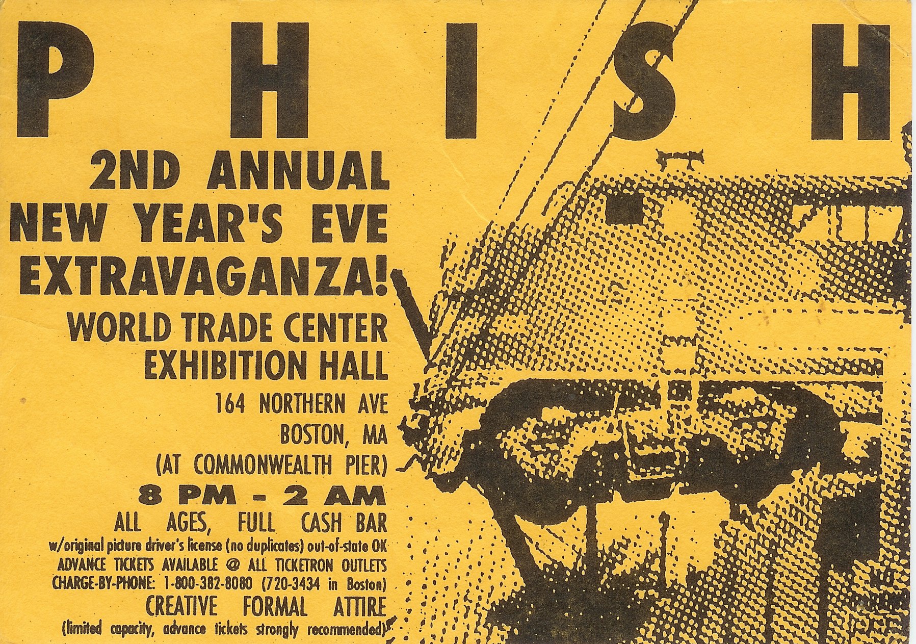 This show was kind of a bust for a few reasons. That said, it is a New Years show so it does have some historical significance. That said, it kinda sucked. The New Years run in ’90 consisted of the 12/28 show at the Marquee in NYC (which I saw), and a 12/29 show at the Campus Club in Providence (which I skipped). Both shows are pretty hot by 1990 standards and I think each were longer than this one. That is my main gripe with NYE 1990– it was disappointing to say the least that the ENTIRE show was 2 hours long. Two sets, one hour each. Grrrrrr……I definitely blame Chucklehead, “the opening band that would not get off”. A local Boston funk band, we knew them from the scene and they were known as a “decent” funk band, but their set went on and on and on. And on. It was almost comical. I want to say they played for two hours, it was redic. So that was strike number one. The venue itself was a non-descript event hall (still is) and was just a big room, no seats, with some bars in the back. I stayed at the bars for most of Chucklehead getting primed for teh Phishes. The show itself was pretty crowded but it was barely sold out. When we arrived an hour or so before doors, there were kids lined up waiting for the box office to open so they could get “day of” tix…..I doubt that is happening this year (or has since). This was also the site of the first “real” Phish NYE, the band having played here the year before on 12/31/89 (DJ Bagel Boy’s first show as a matter of fact.) Also, the ticket called for “Creative Formal Wear Requested” but most people ignored that. The band did get dressed up though and there are some good pics around of that, I think some are in The Phish Book. So, non-descript venue, random crowd energy and an opening band that would not stop was not exactly setting the stage for a bomb drop. It’s kind of ironic that the actual poster for the gig is a picture of a trainwreck. Still it was not all that bad. At least there was a bar. Still, I can’t fault the boys, they gave it their all (as usual). The playing is actually pretty decent for the most part, it was the venue that blew. Here’s the set: